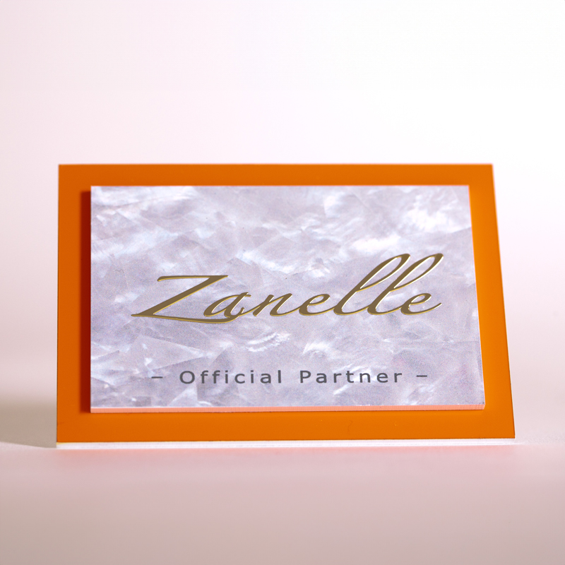 Unter Verwendung einer perlmuttimitierenden Heißprägefolie können wir im Kunststoff-Spritzguss-Bereich eine kostengünstige Alternative anbieten, wobei die Farbtendenz hier in Richtung grau-metallisch geht. Bei abgebildeten Aufsteller „Zanelle“ wurde der Perlmutt-Hintergrund als Digitaldruck ausgeführt.