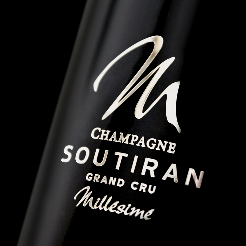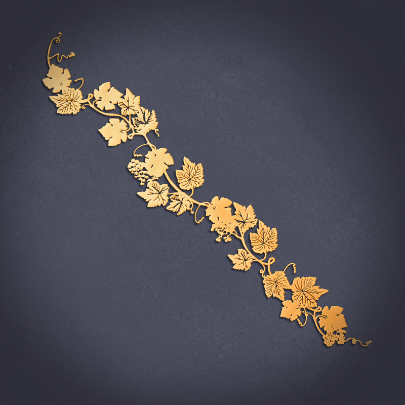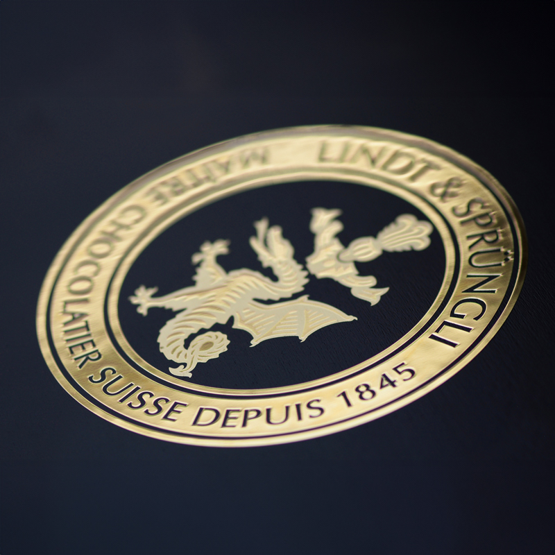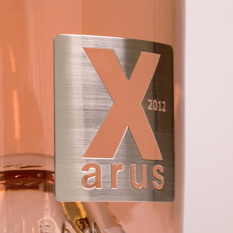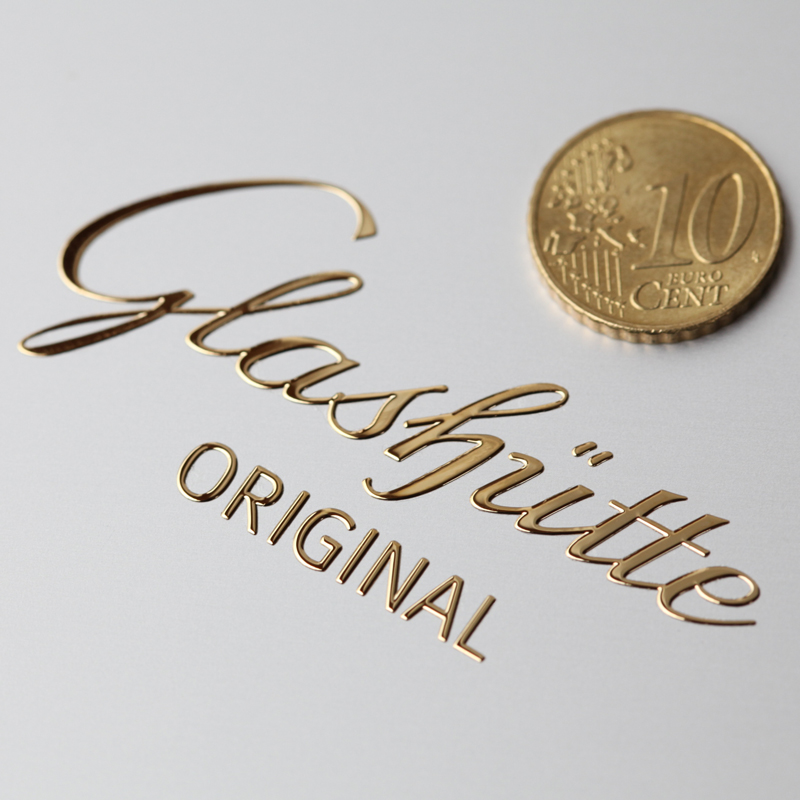 Im obigen Beispiel ist die Basis ein gold glänzendes Transcript A.T., wobei der rechte Ausschnitt Details des filigranen Dekors zeigt. Die Textdetails sind dagegen in einem matt goldenen Farbton realisiert, der besonders edel wirkt. Wir montieren die beiden getrennt gefertigten Metallintarsien zu einem einzigen Etikett. So entsteht der gewollte Ton-in-Ton-Effekt: matter Text auf glänzendem Grund. Durch eine